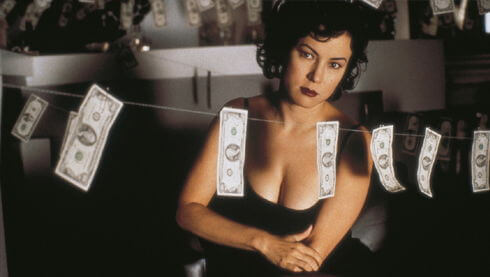 The film’s most knowing, tongue-in-cheek moments take advantage of the setup, delaying the homosexual coupling as long as possible through sexualized banter and imagery—just as film noirs from Double Indemnity (1944) to The Big Sleep (1946) had done in their heyday. Prior to their first embrace, Violet calls Corky over to extract a piece of jewelry she’s accidentally dropped down the sink (an old lonely housewife’s trick for seducing the local handyman). Confident, Corky smiles and says all she has to do is “open it up, tinker with it a bit, and fix it.” The Wachowskis’ frame shows Corky in the foreground, using her strong hands to manipulate the pipes and “find it,” while in the background we see only Violet’s legs and hips, the association unmistakable. Elsewhere, the Wachowskis incorporate sexuality into smaller details; for example, Corky plays the most vaginal looking of all instruments, the twanging mouth harp. After they finally bed one another, it’s almost disappointing that their comically erotic interplay lessens.