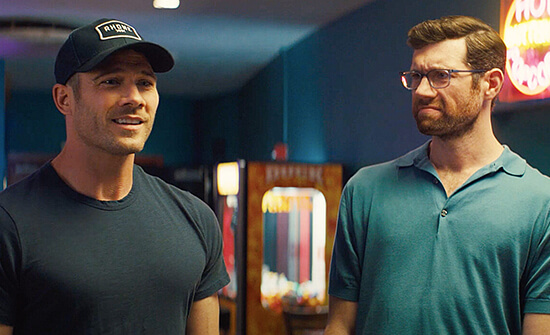 Bros also has the distinction of introducing Eichner as an actor with impressive dramatic range. As Bobby, he has plenty of loud and in-your-face moments that his Billy on the Street fans will recognize. But Bobby’s outrageous behavior might just mask his inner discontentment. In the opening scenes, he justifies his life of random hookups with his professional success, rationalizing that he has “a lot more than a lot of people have.” But his resting angry face and pride in being “emotionally unavailable” might be a shield, and his inability to flirt has made him an outsider in the gay dating scene. Then he meets Aaron (Luke Macfarlane), a jockish hunk who, like Bobby, doesn’t date and avoids commitments. However, Aaron’s tendency to disappear like Batman attracts Bobby, and despite some initial bumps and hesitations, they start a romantic relationship. Yet both have insecurities they must overcome: Bobby worries about his skinny appearance next to the ripped physiques of the men Aaron is accustomed to; Aaron feels intimidated by Bobby’s confidence and struggles with some internalized homophobia. But Bobby’s powerful speech that “confidence is just a choice you make” bonds them further and becomes the film’s emotional breakthrough.