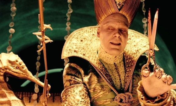 Costume designer Eiko Ishioka rendered the sinewy armor of the young Count in Bram Stoker’s Dracula, and here, her creations are equally impressive. The suits that the doctors and patients of the psychoanalytic technology must wear are almost identical to the aforesaid armor, but Stargher’s representations, seeing himself as the colossal god of a horrendous world, ranges from twisted to terrifying and not much else in between. Long capes, his hair twisted into horns, rings clamped into his back to suspend himself, and lizard-like decorations about his body—they’re frightening and oddly stunning descriptions.