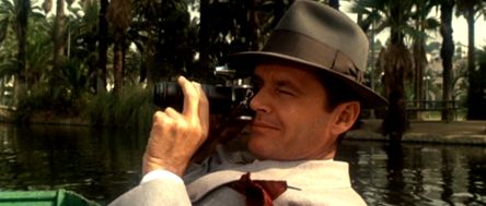 Polanski and Towne labored to include visual cues and hints to imply Jake’s unseeing condition and further hint at Evelyn’s death, and effectively keep water “on the brain” as well. Throughout the picture, there are a series of binary lenses, lights, and glass objects found broken or made so by Jake’s interference, foretelling Evelyn’s eye being shot out: Jake sets down two pocket watches on either side of Hollis’ automobile tire to determine when his car leaves a water dumping ground, and afterward one is broken; one of the lenses in Jake’s sunglasses is broken by protective farmers when he’s caught snooping around an orange grove; before Jake follows Evelyn’s car, he shatters one of her brake lights so he won’t lose her in the night; later, Jake finds a pair of glasses in the Mulwray’s tide pool with one lens missing. There are just as many references to water or lack thereof: the drought in Los Angeles, Hollis drowning, Hollis standing at the ocean and row-boating with Katherine, Jake’s visit to the reservoir, the saltwater tide pool, the Albacore Club with its flying fish symbol and fish served head-on for lunch, and an exhaustive number of references to water in the dialogue. These broad-stroke citations barely begin to tap the intricate level of detail Polanski and Towne achieve in Chinatown, and to identify all of them would be missing the point.