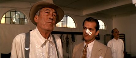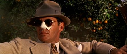 Jake suffers from what Towne calls “the futility of good intentions,” a near compulsive drive that impels his search no matter what harm befalls him. This compulsion also carries over to the audience, as Polanski delivers the film from Jake’s subjective point-of-view. We know only what Jake knows, save for one exception when he retells a dirty joke to his associates. But unbeknownst to him, Evelyn Mulwray is standing right behind him. This is their first encounter and denotes her power over him as a femme fatale. At the outset, his investigation progresses with only minor obstacles and awkward waiting, littered with Polanski’s comic use of quirky “gate-keeper” characters to present negligible annoyances for Jake: Mulwray’s irritated secretary; Evelyn’s Chinese butler; the snooty, pimple-faced records keeper. These often humorous tropes suddenly develop into something far more dangerous when Jake investigates the reservoir and finds evidence of water runoff. But he also finds two goons, water department security Claude Mulvihill (Roy Jenson) and a “midget” henchman (Polanski himself) with a knife. Jake’s nostril pays the penalty of poking his nose where it doesn’t belong when Polanski’s henchman slices it, introducing an aspect of violence not yet felt in the film. This is a wound the director refuses to grant a miraculous overnight movie recovery for; instead, Jake spends most of the remaining film with a deliberately distracting white bandage on his nose. And after he removes the bandage, we see his visibly stitched-up wound. It’s a constant reminder that Jake’s investigation is going places it should not. Worse, given his Chinatown history, this is a lesson he should have already learned.