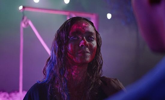 The comfortable, homey quality of the Gardner farm is interrupted one night by a slow-descending light from the sky. As Lovecraft writes, “in one feverish, kaleidoscopic instant there burst up from that doomed and accursed farm a gleamingly eruptive cataclysm of unnatural sparks and substance; blurring the glance of the few who saw it, and sending forth to the zenith a bombarding cloudburst of such coloured and fantastic fragments as our universe must needs disown.” Stanley brings such prose to vivid life with inspired production design by Katie Byron and sometimes cheap-looking CGI to render the spatial luminescence that puts some of the family in a trance. Almost immediately, the poisoned water begins to produce strange flowers, pink insects, and oversized produce in the family garden, while everyone’s behavior begins to alter. Though Stanley and Armaris enrich the source material with otherwise absent characterizations, they sacrifice Lovecraft’s austere, mythological storytelling for a demented streak of humor, some of it Cage-based and some rooted in the sheer insanity of the ensuing horror.